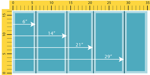 - Following the diagram below, cut the panel into five pieces as shown. If possible, use a rotary cutter and see-through ruler for a clean, straight cut. If you don’t have a rotary cutter, draw in guidelines to follow with scissors to insure a precise cut. When you cut along your four drawn lines, you will end up with five panels: two 6″ outer panels, two 8″ pocket panels and one 7″ center panel.
