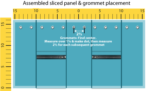 - Remove the main center point pin. From each remaining pin, mark for five additional grommets to the right and five to the left. Each of these subsequent grommets will be 2½” apart as shown in the drawing below.