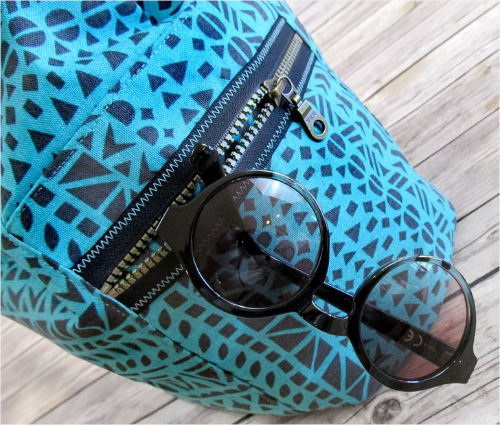You get a handy zippered pocket along each side. We did a fun outside application with the zipper, zig-zagging it in place on the top of the exterior fabric. It adds a bold bit of decorative stitching interest and is a super easy way to insert a zipper. And, if using a striped exterior fabric as we did, try placing the pocket stripes perpendicular to the main stripes of the exterior.