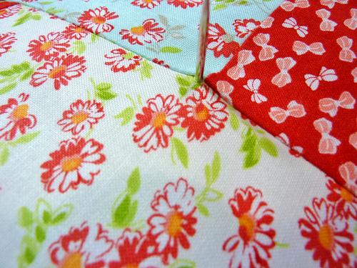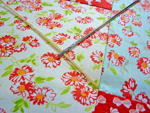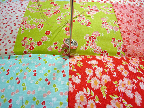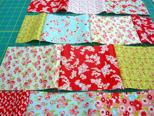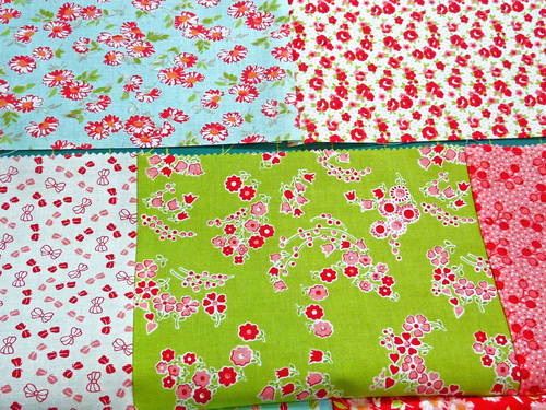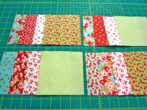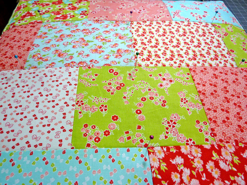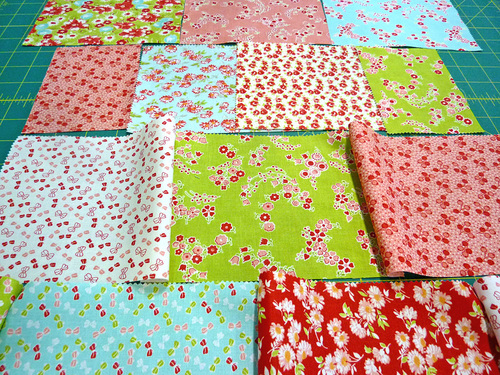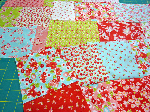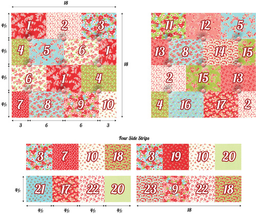 From the Bonnie & Camille Little Ruby collection for Moda Fabrics, we used the following – follow the same pattern with your own fabric selections or design your own layout within the same size parameters: