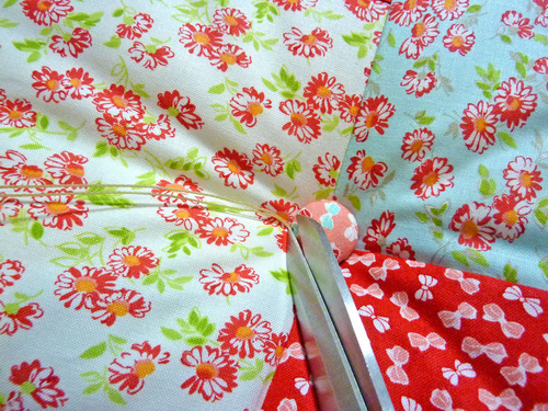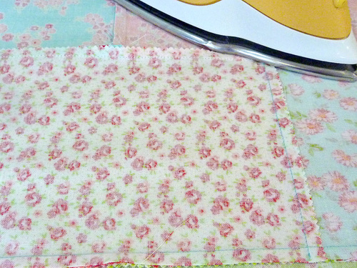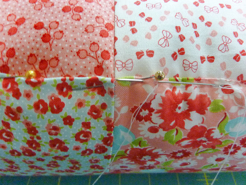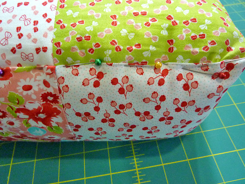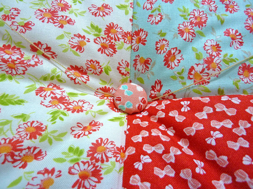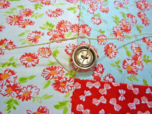 NOTE: As mentioned above, our pretty patchwork design originally used the Little Ruby collection by Bonnie & Camille for Moda Fabrics. We used a Layer Cake, selecting 24 different 10″ x 10″ squares from which to cut all our pieces and prepare the covered buttons. We evaluated a number of options to create a cohesive color palette with a pleasing mix of motifs. We refer to these fabrics throughout the instructions below. For more about the best ways to mix and match designer fabric, take a look at our informative tutorial.