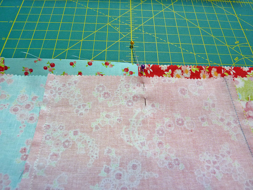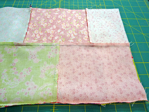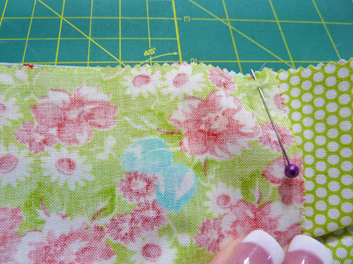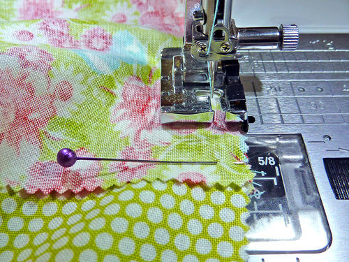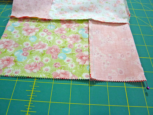 - Working in order, either top to bottom or bottom to top, place the first two pieces of the first row right sides together along their inner edges. Pin in place.