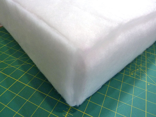 - Wrap one length around the foam one way and the second length around the foam in the opposite direction. This gives you one layer of batting along each side and two layers top and bottom.