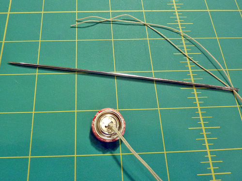 - Find a second covered button. Insert one free end of the thread through the shank of the second covered button. Then tie the ends together into a knot.