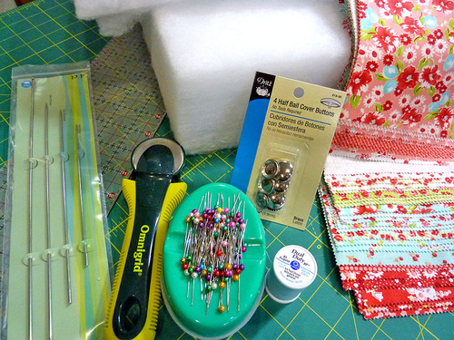 We originally used a Layer Cake from the Little Ruby collection by Bonnie & Camille for a happy, summery blend of fresh florals. A patchwork surface is always an interesting one for tufting because the intersecting lines of the pieces give you a perfect grid for your stitching points. Little Ruby is no longer readily available, but we invite you to visit our friends at Fat Quarter Shop for dozens of new Layer Cake options.