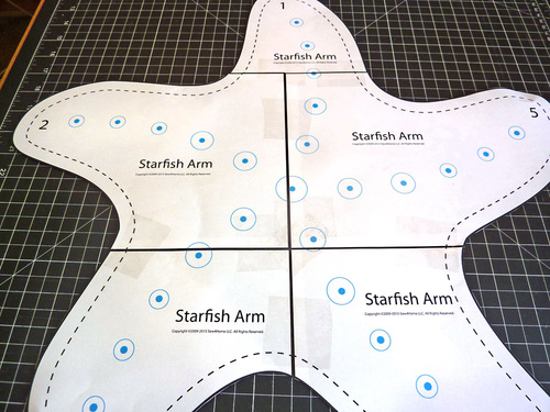 IMPORTANT: Each page in the PDF is ONE 8½” x 11″ sheet. You must print the PDF file at 100%. DO NOT SCALE to fit the page. There is a guide rule on the Starfish Arm 1 page so you can confirm your printer is set to the proper scale. Print horizontally (landscape). - Cut out each pattern piece along the solid line. Butt together the five pieces (do not overlap) following the assembly diagram shown on each page. Tape together to create the full starfish pattern.