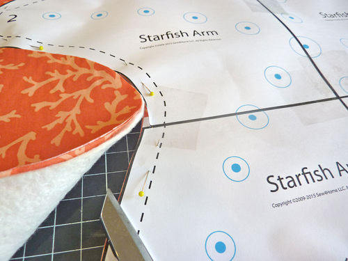 NOTE: If you want a very specific fussy cut, it would be better to cut each starfish piece individually rather than layering. That way you can adjust the pattern to best capture your motifs for both the front and the back. - Pin the assembled pattern in place through all three layers(two layers of fabric, one layer of batting).