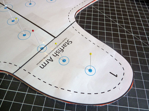 - Working along one arm at a time, gently pull back the paper pattern to reveal each pin point and place a mark on the fabric.