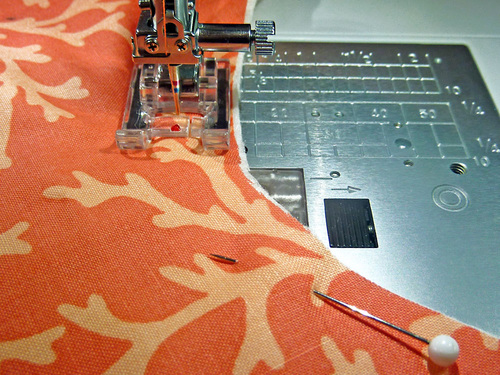 - Using a ½” seam allowance, stitch around the entire perimeter of the pillow. Shorten your stitch length and go slowly around the all the curves. Remember to lock your seam at either side of the 4″ – 6″ opening.