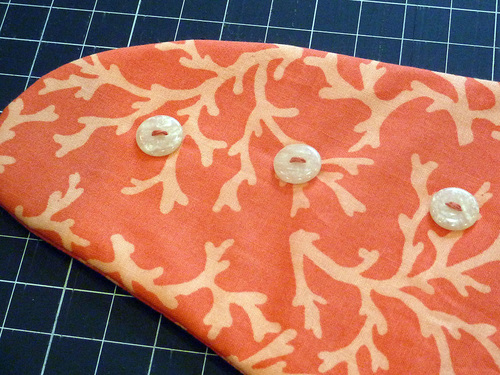 - Using your favorite method, stitch each button in place through both the fabric and batting layers, following the diagram on the pattern.