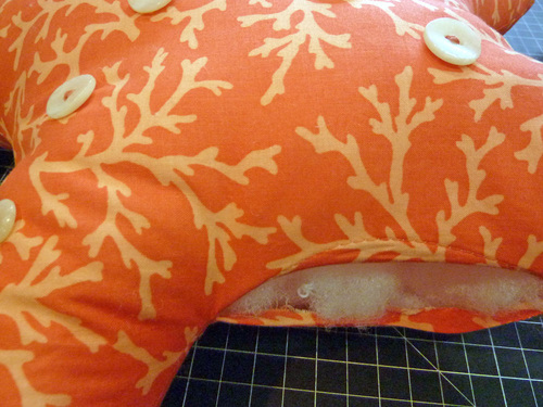 - Stuff the pillow with polyester fiberfill. The pillow should be stuffed so it’s pleasingly plump but do not over-stuff as it will distort the shape. Take a handful of loose fiberfill and fluff the fibers with your fingers to remove any clumps. To do this, gently separate the fibers as if teasing hair. Insert these small handfuls of fiberfill, starting with the outer curves of the arms and working toward the the opening. We have a tutorial that covers more pillow stuffing tips and techniques.