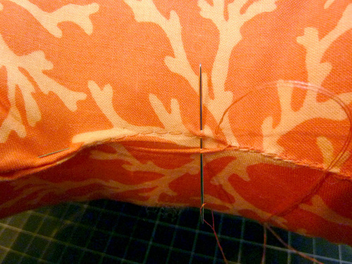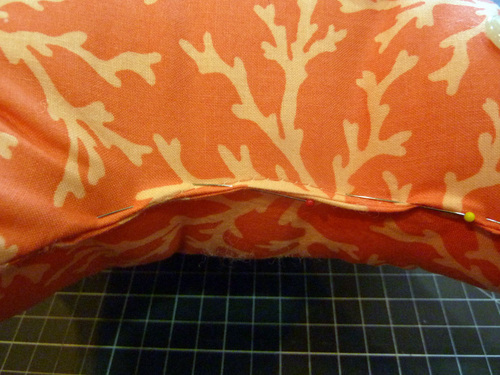 - Fold in the raw edges at the opening so they are flush with the sewn seam. Pin closed.