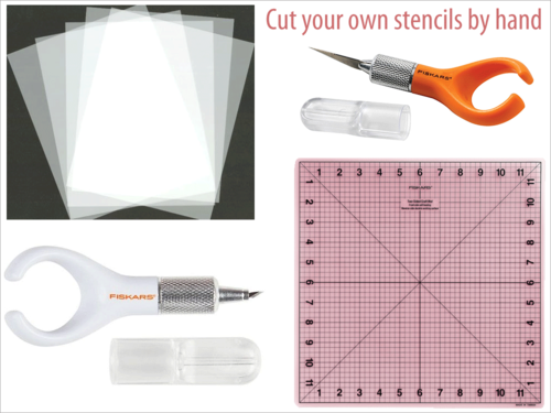Making your own templates is also an option. You need a sheet of clear plastic, an X-Acto knife, and a cutting mat. Position the plastic sheet over the design you want, and cut it out by tracing the lines with the blade.