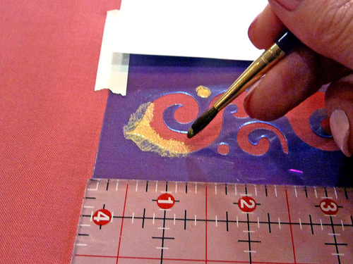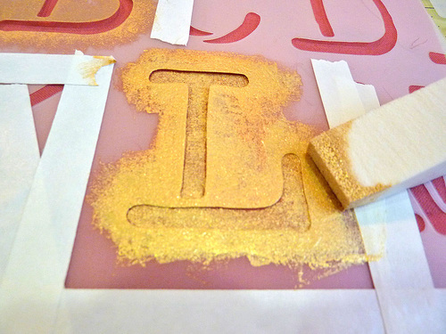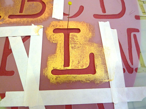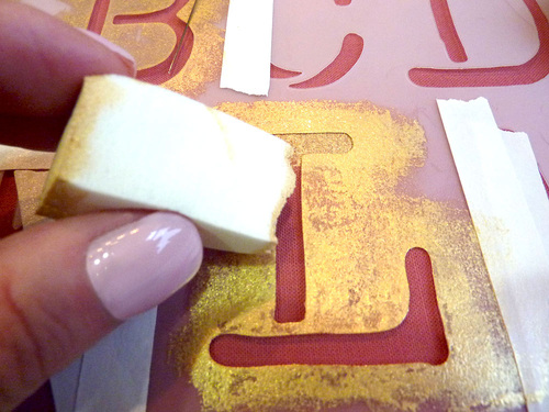 - Center the motif over the top of the letter, tape out nearby designs, secure the stencil in place, and apply the paint in the same manner as above.