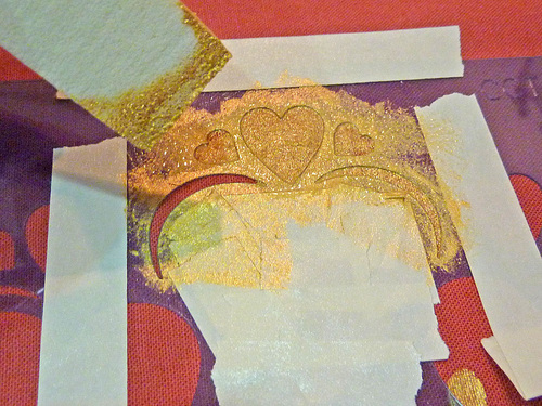 - Tape the stencil in place. As mentioned above, tape securely and/or use a stencil adhesive to insure your stencil is flat as the proverbial pancake!