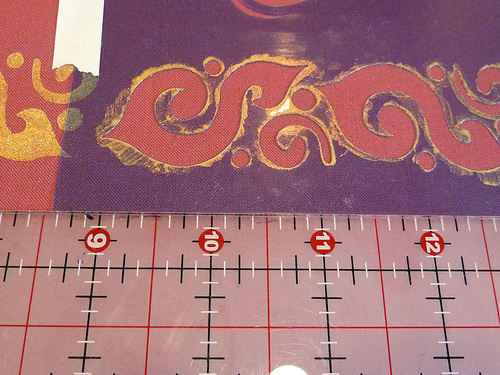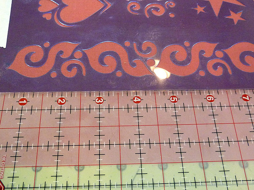 - When dry, replace the stencil to create the next section of border. Again, the exact placement will depend on your stencil. Measure the distance between the cut sections of the design motif. Our design sections were approximately ¼” apart. We overlapped the stencil so our new starting point was ¼” from the ending point of the first section. Tape in place.