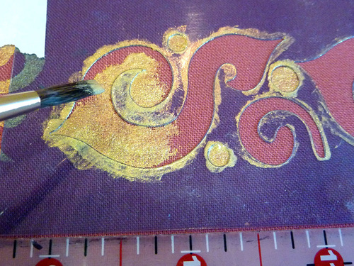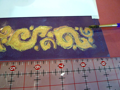 NOTE: As with many techniques, we always suggest testing everything first on a scrap to make sure it’s all working. We found the metallic paint didn’t look very metallic until it started to dry a bit. Testing first allowed us to figure out how heavy a layer of paint was needed. You can also very carefully lift up one edge of your stencil, checking underneath to see how it’s looking.