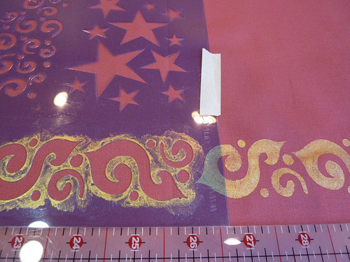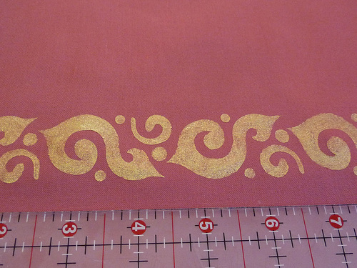 - Repeat on the opposite side of the center point. For our stencil, we applied two sections to the right of center and two sections to the left of center, creating a continuous border that ended approximately 2″ from the raw side edge of the fabric on each end.