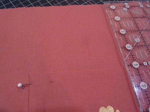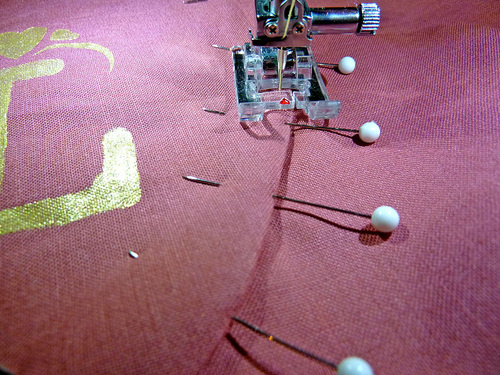 - Find the stenciled pocket, which should be dry. Fold it right sides together and pin in place, leaving an approximate 2″ opening along one side near the top (you want the opening to be along the straightest portion of the pocket).