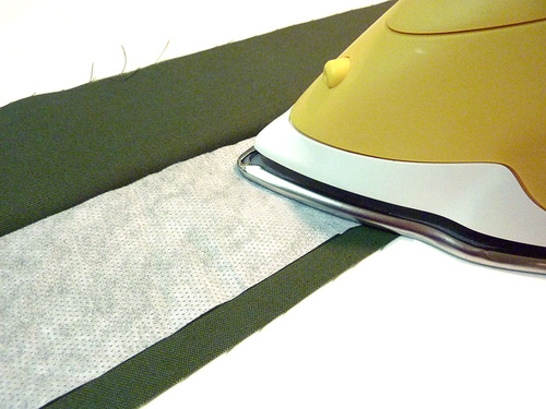 - Find the pocket and interfacing. Following manufacturer’s instructions fuse the interfacing to the wrong side of one half of the pocket.