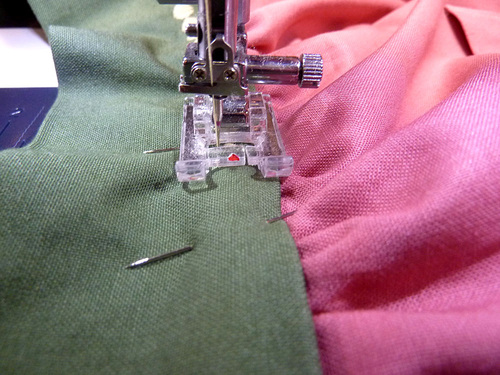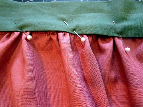 - Bring the folded edge of the waistband down into place, covering the seam you just made. Remove any gathering stitches that show. Pin in place.