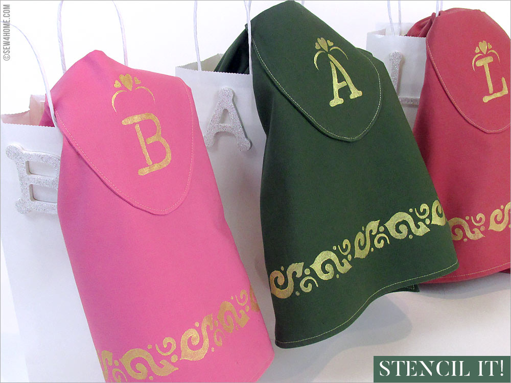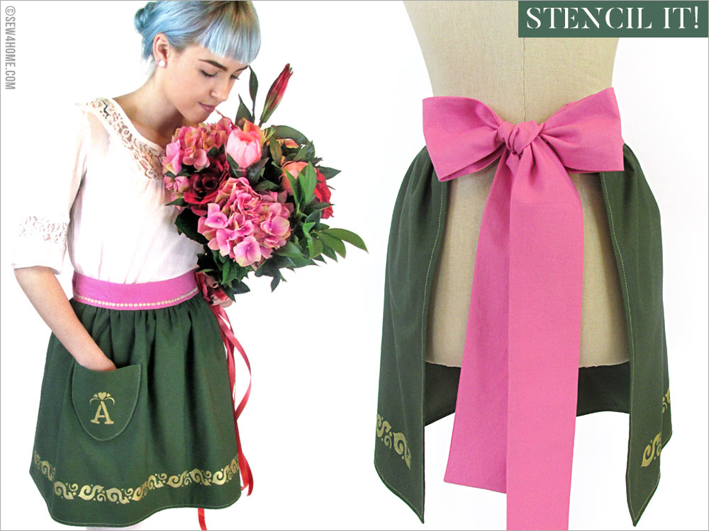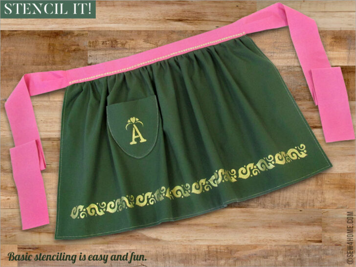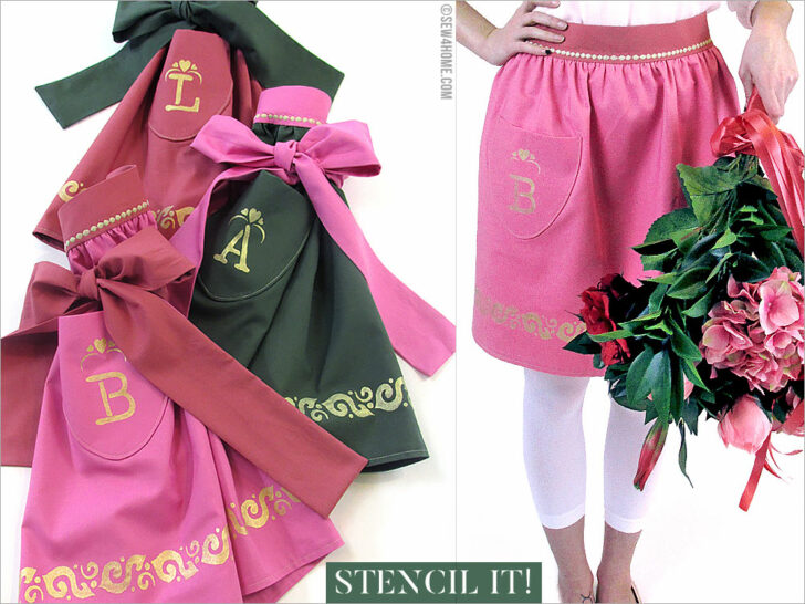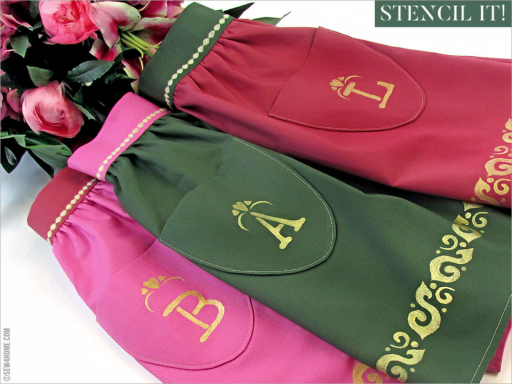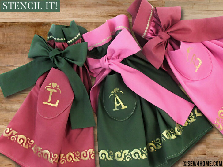 We’ve used it to embellish a set of pretty half aprons. A coordinated set of these aprons would make great gifts for a bridal party or a cooking or crafting collective. When you are making four, five, six or more of one thing, cost and complexity are concerns. These aprons are quick, easy, and unique. A line of decorative stitching in a color to match the stenciling is an extra-special touch.