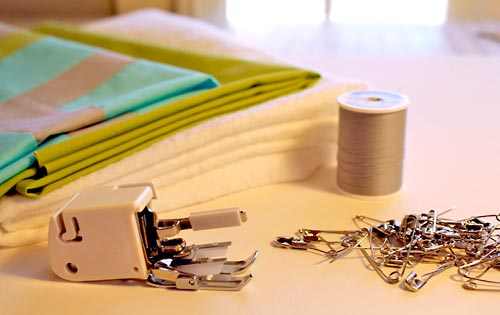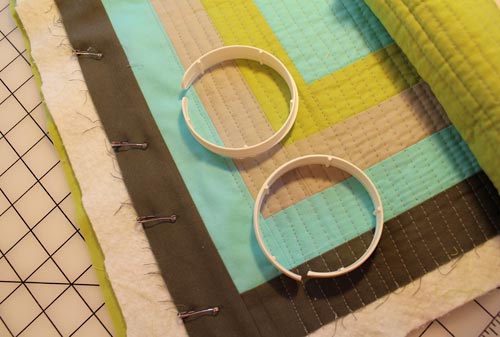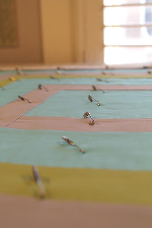 NOTE: You can use regular safety pins, but I prefer to use special quilter’s pins, which have a slight bend in the part of the pin that pushes through the fabric. This little bend in the metal makes pinning through all of the layers much easier.