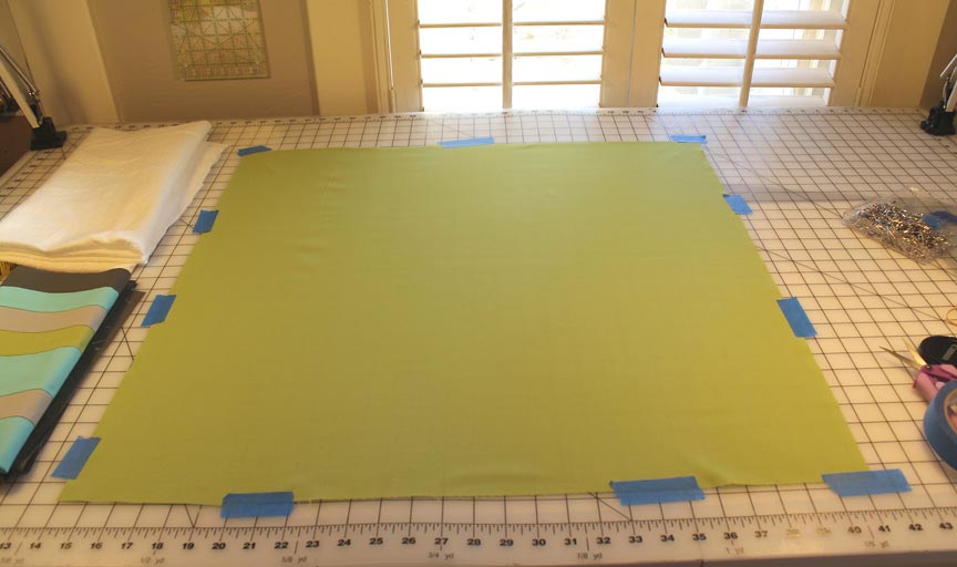 First, lay the quilt BACK on a flat surface, right side down. Use the blue painter’s tape around the perimeter to hold the edges in place. Using your hands, smooth out any wrinkles or air bubbles that may occur, pull the fabric taut, and secure with pieces of tape.