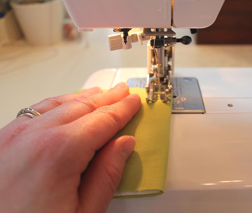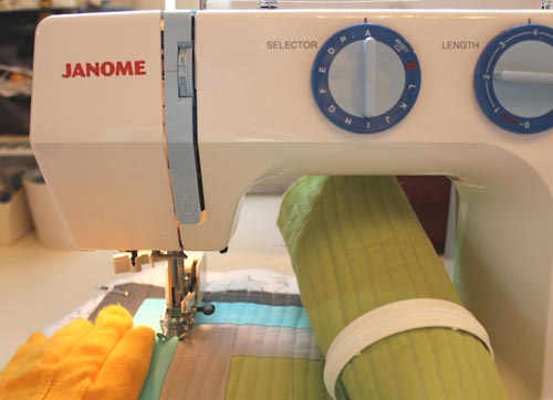 Go slowly as you begin to move the fabric through the machine. Be sure to remove the safety pins as needed. This should be done when your machine is stopped with the needle in the down position so the fabric doesn’t shift.