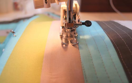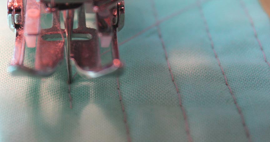 On small quilts, I always start on one side of the quilt and work across the width of it, until I have quilted the entire piece. Also, I always backstitch at the beginning of each line of quilting to lock the stitches. When I start quilting, I use the edge of the fabric as a guide, keeping my walking foot placed along it as I stitch.