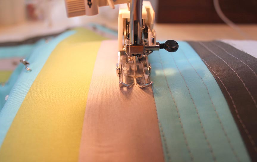When I am straight-line quilting, I always increase my stitch length and decrease the pressure of my presser foot. Not all machines can make these adjustments, but if yours can, I highly recommend you do both before you start to quilt. By decreasing the pressure of the presser foot, there will be less chance of the layers puckering during the quilting process.