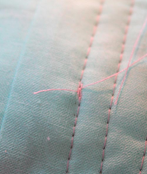 Make two to three stitches there, and then backstitch to lock the stitches. Then, continue quilting as before. After you finish that line of quilting, take your scissors and snip the tails of the thread.