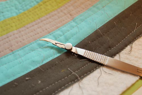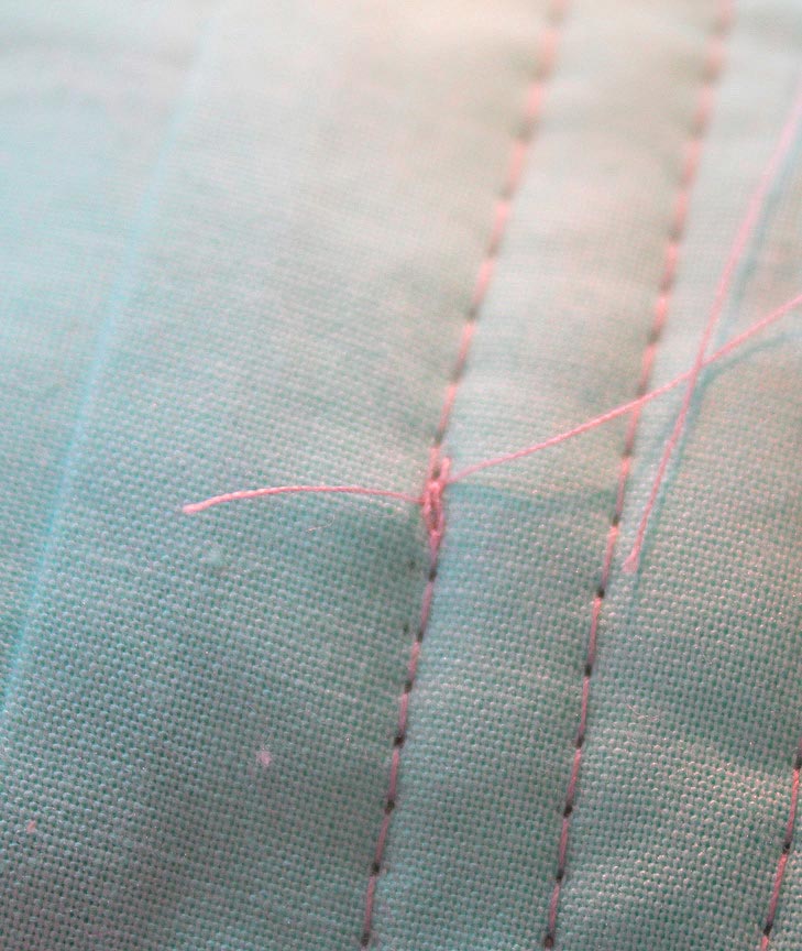 Remove the quilt from the machine and clip the thread tails close to the fabric at the beginning and end of the stitching. This will keep them from getting caught in the next line of quilting.