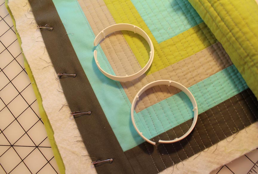 Quilts can be kind of bulky to move through your machine and these plastic clips can really help reduce that bulk. Just roll up your quilt, slide the clips on, and place your quilt on the machine. Much easier to handle! Adjust the clips as necessary to unroll as you quilt.