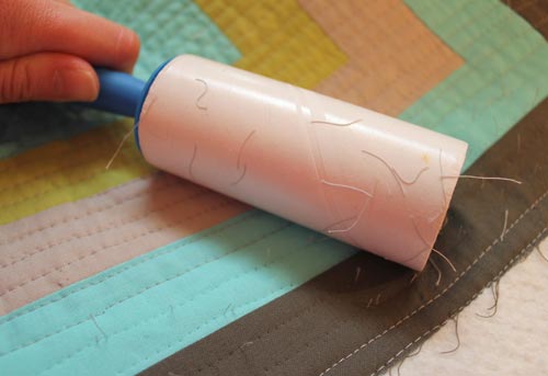 I use a lint roller to pick up all of the excess threads before I begin to quilt again. Quick and slick!
