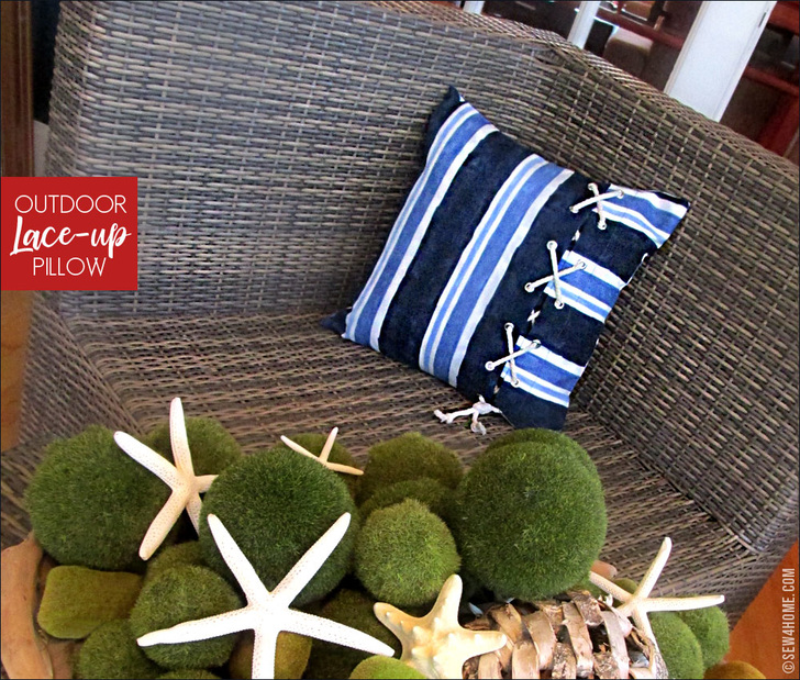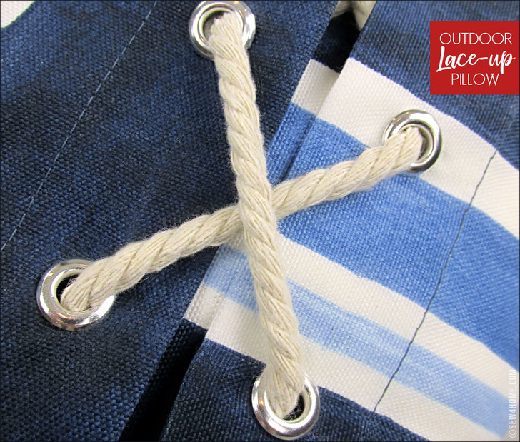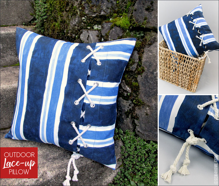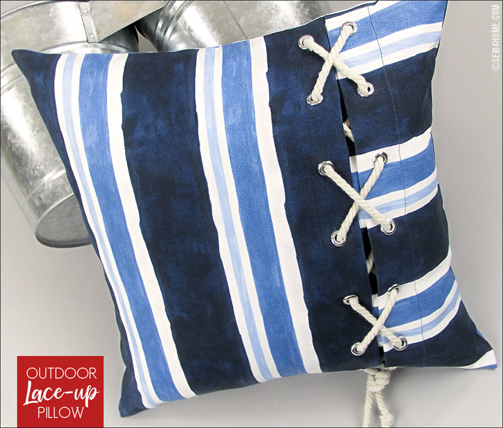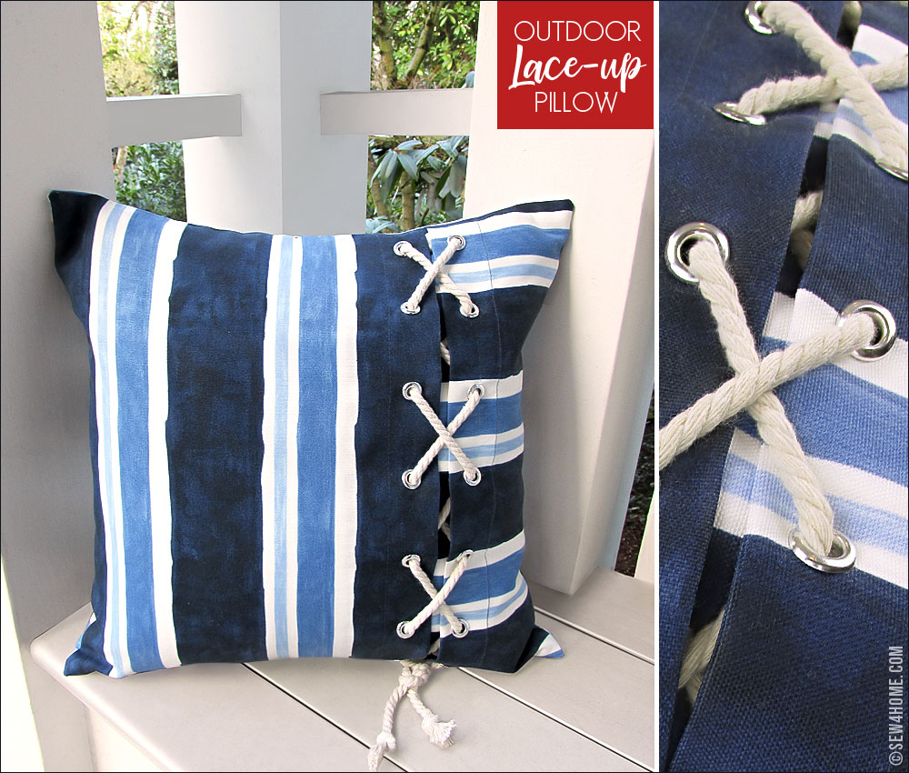 I love the surge of inspiration the sunshine brings… mostly because I’m excited to start planning spring and summer sewing projects! This fast and easy pillow is perfect for the outdoor fabrics that make their appearance in stores and online this time of year. Our cute criss-cross lacing along the front closure has a fun nautical spin.