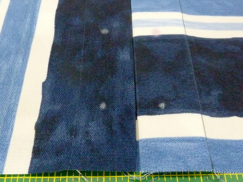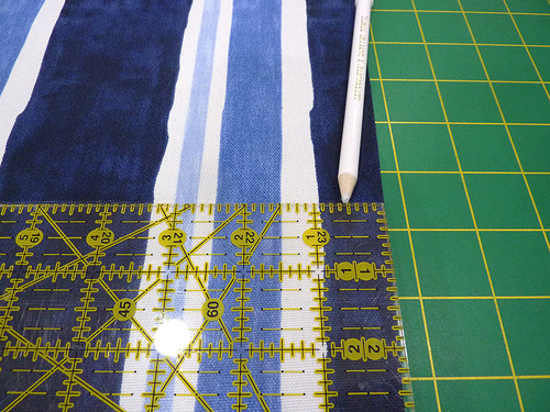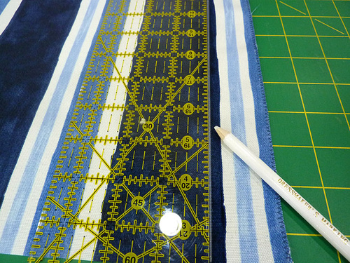 - Working from the unfinished 17” right raw edge, measure 3½” in and draw a vertical line parallel to the right raw edge, which means the line runs perpendicular to the stripes of the fabric.