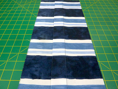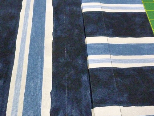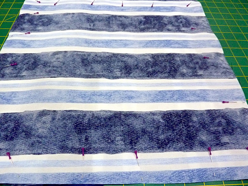 NOTE: We simply pinned the panels in place. For extra security, you could machine baste across the two panels at the top and bottom. Simply stitch across the gap within the ½” seam allowance. - With the front panels secured, find the back panel. Place it in position (remember, our back panel stripes were cut on the horizontal), right sides together with the front panel. Pin together along all four sides.