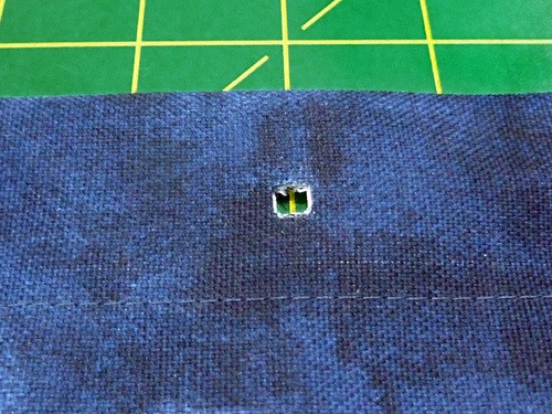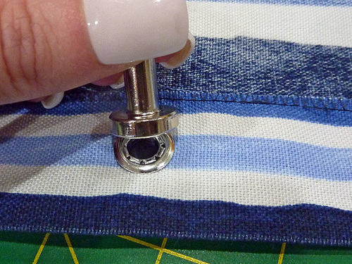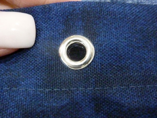 NOTE: Remember, on the right front panel, you are inserting the grommets through the tucked fold only, do not cut through to the facing below. On the left side, you are going through the two layers of the folded fabric.