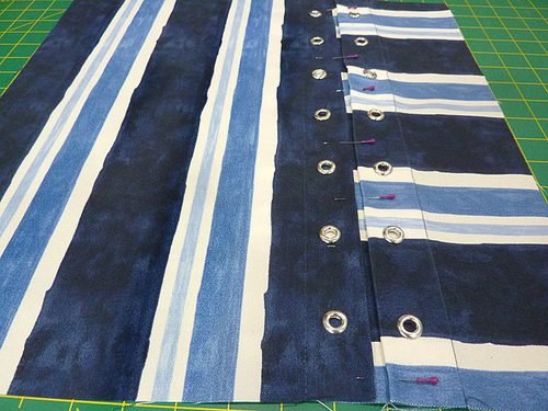 - Place the left and right panels right side up and side by side on your work surface. Align the two panels with a ¼” gap between the folded edges. With the panels aligned top to bottom, with the grommets parallel with one another top to bottom, and with that ¼” gap consistent top to bottom, pin the panels together across the gap.