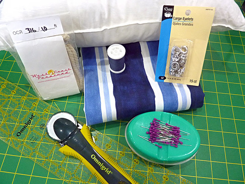 NOTE: We used a full yard because our stripe motif was was quite wide and we wanted a precise fussy cut of all the panels, running in two different directions. The actual cuts are listed below in the Getting Started section. If your fabric is wider, as outdoor fabric often is, and/or if you choose a narrower stripe or a different, more random motif, you may be able to get away with just a half yard. - FOURTEEN ¼” eyelets/grommets and appropriate setting tools; we used a Dritz Large Eyelets Kit that comes with setting tools – a kit comes with 12 eyelets so we purchased two kits