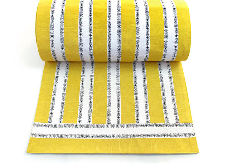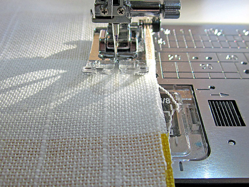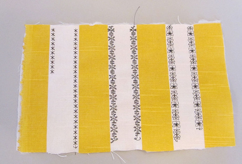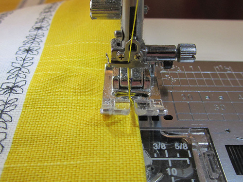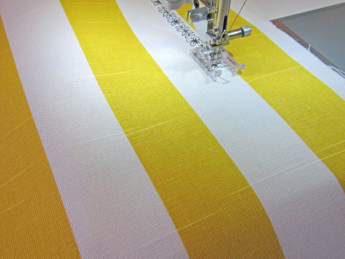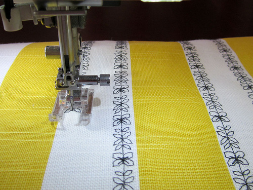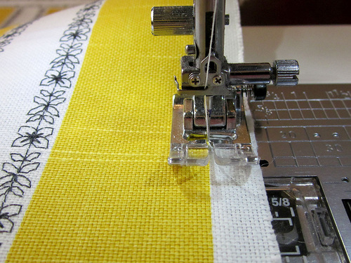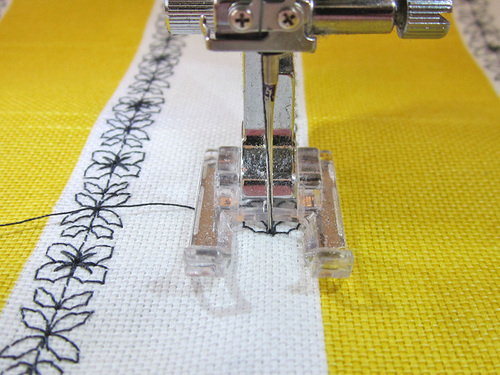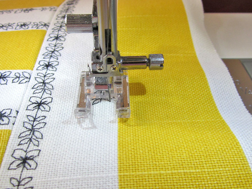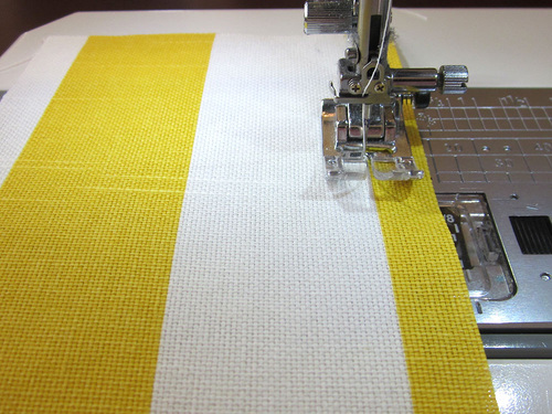 - Use the inner edge of the foot to guide your line of stitching along the edge of the outer yellow stripe (within the white stripe). Stitch a line of decorative stitching along both sides of each white stripe. Keep your stitching inside the white stripes; it should not go into any of the yellow stripes.