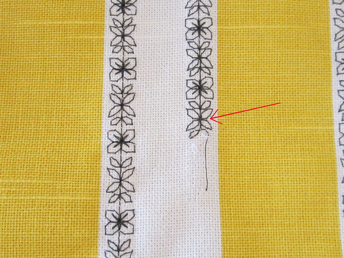 - In the photo below, you see an example of running out of bobbin thread in the middle of a length of decorative stitching. The arrow points to the end of an individual pattern.