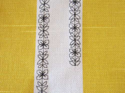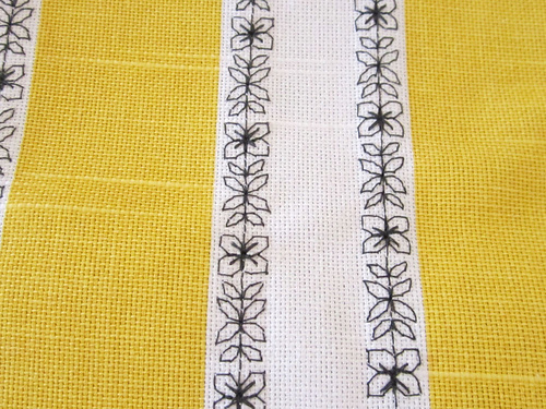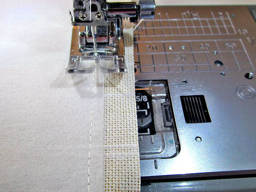 - Sew a line of decorative stitching on each side of just the white stripe.