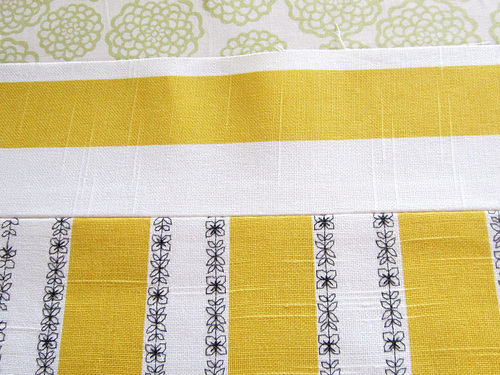 - From this piece, fussy cut THREE rectangles across the width. Working with our 1½” stripes, each rectangular panel included six yellow stripes and five white stripes with ½” for a seam allowance on each side. All the stripes are running vertically.