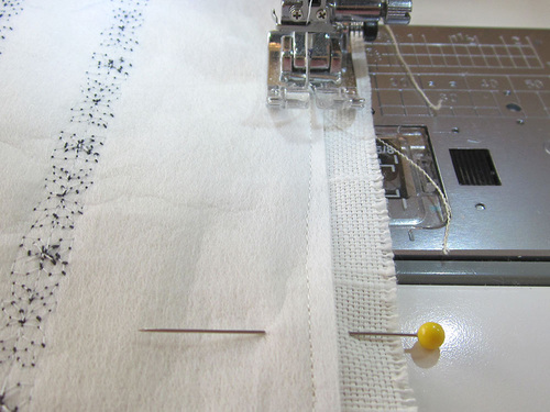 - Place one strip on either end of the panel, aligning the stitched-reference-line edge of the end panel with the raw edge of the runner. Pin in place.