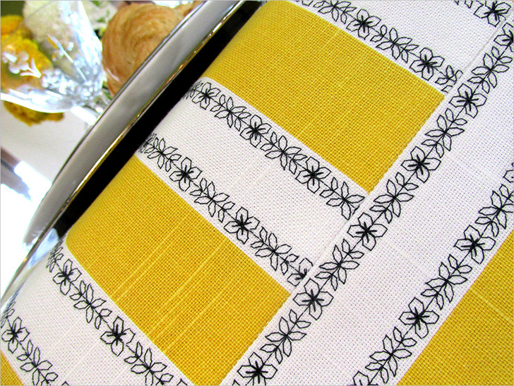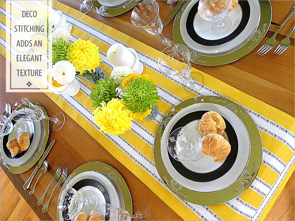 Start with a simple yet bold fabric, add some distinctive decorative stitching, and the result is a stunning table runner that’s a perfect backdrop for any gathering or occasion that calls for a pretty table setting. Remember, “Life is short; use the good china!” We chose a canopy style striped fabric, which is easy to find in a myriad of colors. Thanks to our amazing Janome studio machines, we found the perfect stitch pattern, picked a strong contrasting thread color, and sewed our long lines of embellishment with perfect form and precision… even when running for over 100 inches! Industry-leading stitch quality is one of the main reasons we are so happy to be an exclusive Janome studio.