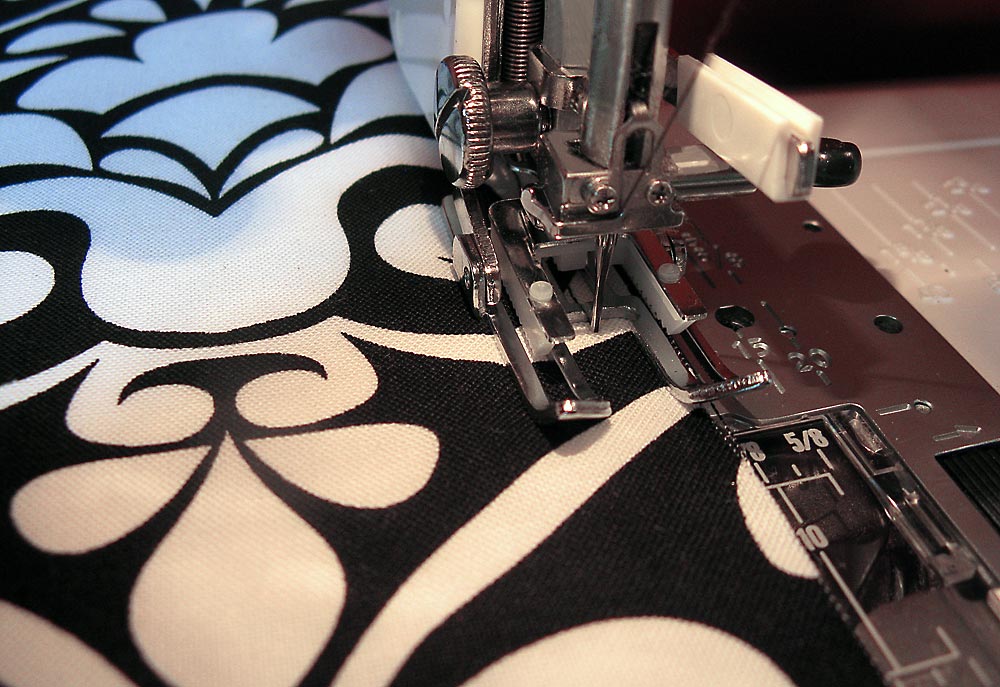 - Using a ½” seam allowance, stitch both sides and across the bottom, pivoting at the corners. We still using a Even Feed foot.