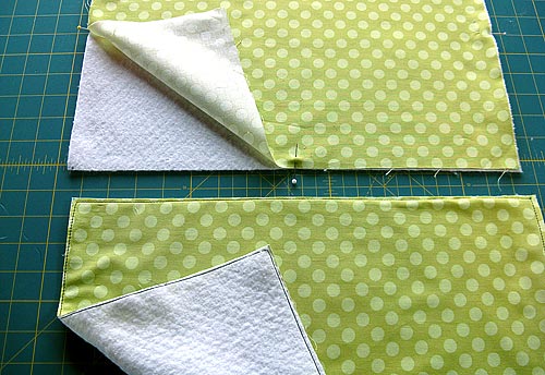 - Make two three-part layers: batting, back fabric right side up, top fabric right side down. Align all raw edges. Pin in place.
