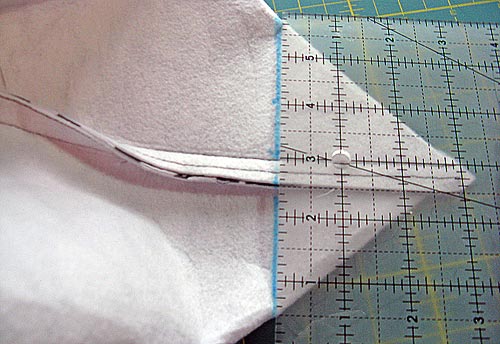 - Pin your folded and measured peak so it stays flat and stitch along the drawn line. As with most boxed corners, we recommend stitching across more than once to reinforce.